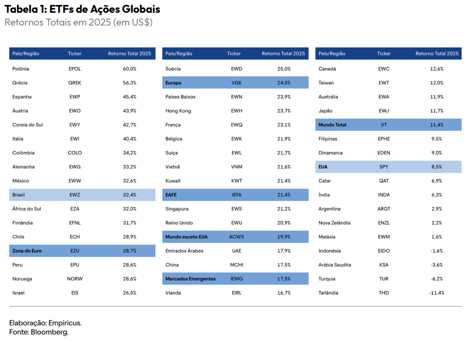 A Empiricus lembra que, historicamente, os ciclos de dólar fraco estão associados a valorizações vigorosas de mercados emergentes, como é o caso do Brasil. Até o momento, a B3 registrou entrada líquida de cerca de R$ 20 bilhões vindos do exterior em 2025.
