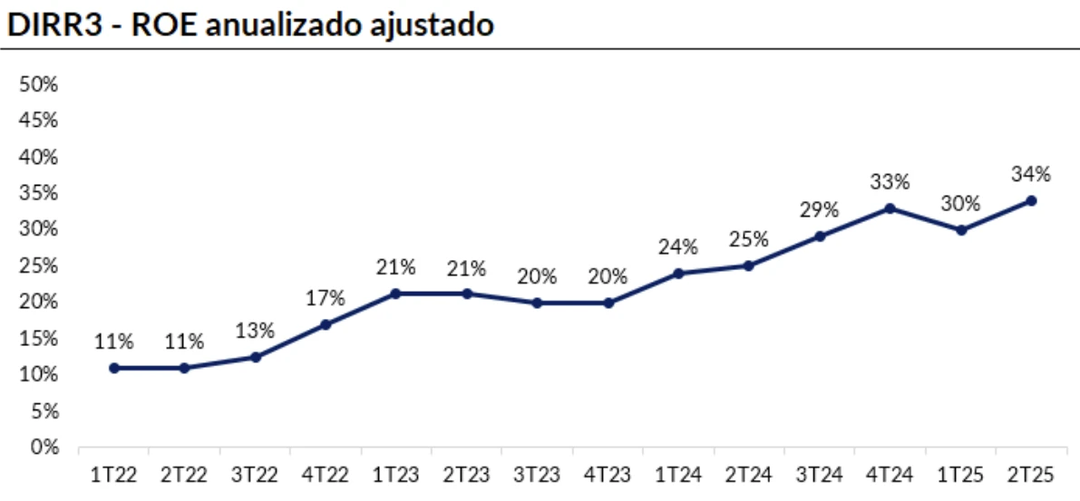 Nesse contexto, a solidez de caixa, combinada à eficiência do ciclo operacional, sustenta margens elevadas e garante retorno consistente sobre o capital investido. Com resultado financeiro favorável, o ROE anualizado ajustado atingiu 34% no 2T25 — o maior da história da companhia — e deve seguir em trajetória de crescimento.