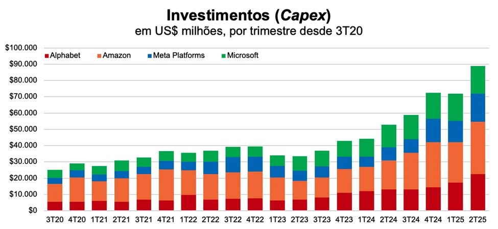 Essa escalada está sendo visível no capex consolidado de Big Techs como Alphabet, Amazon, Meta e Microsoft, que somaram quase US$ 300 bilhões em investimentos em infraestrutura nos últimos 12 meses.