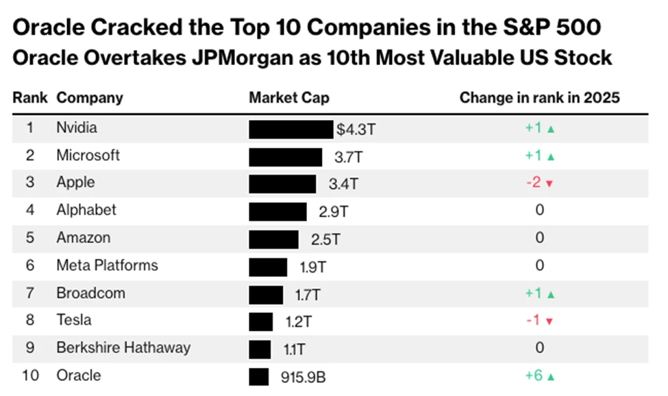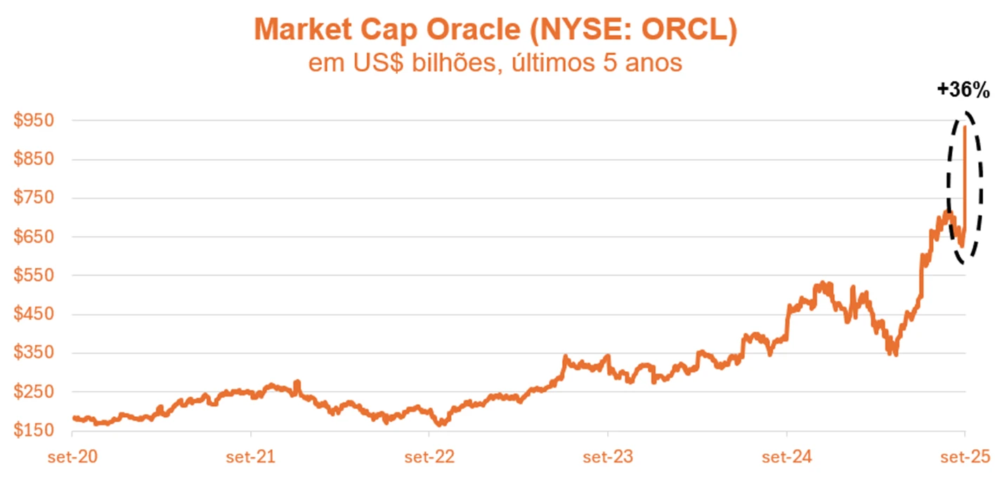 Na quarta-feira (10), a Oracle (ORCL) entregou ao mercado um trimestre fora da curva. As ações dispararam 36% em um único pregão, melhor performance desde 1992, adicionando US$ 238 bilhões em valor de mercado e levando o valuation total a US$ 916 bilhões, se tornando a décima empresa mais valiosa do mundo.
