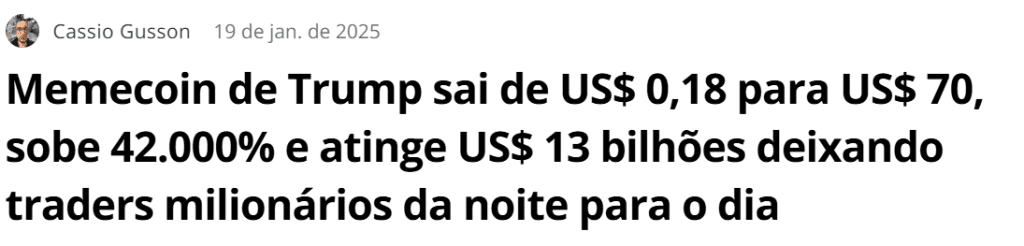 Assim, como memecoins são moedas muito pequenas, quando elas “viralizam” o preço dispara e o investidor pode lucrar muito em pouco tempo.