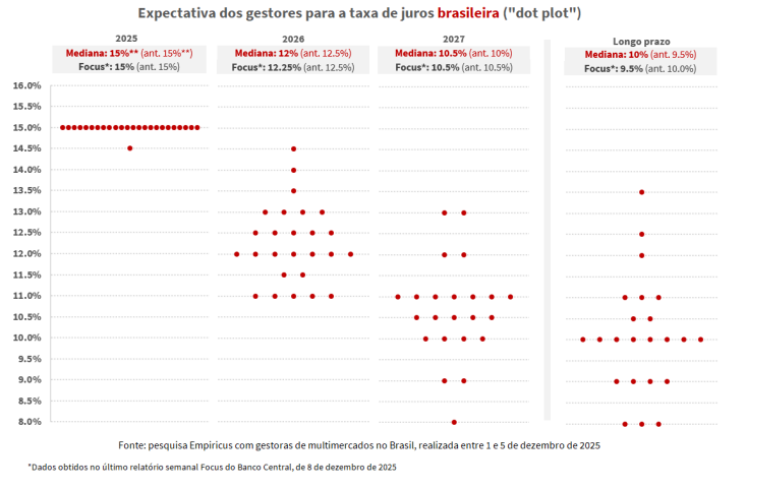 De acordo com dados da pesquisa mensal de dezembro feita pela série Os Melhores Fundos de Investimento, da Empiricus Research, há um consenso de que 2025 deve terminar com a taxa Selic em 15%, reforçando a leitura de estabilidade até o início de 2026, quando é esperado o início do ciclo de cortes.