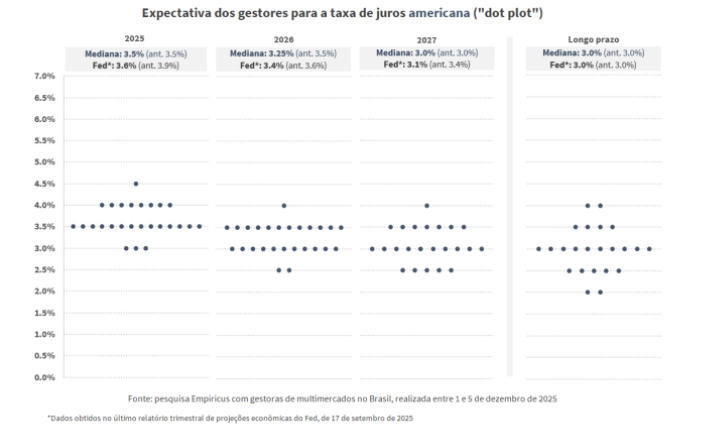 O Fed já iniciou o movimento de redução dos juros, porém os gestores ainda apresentam “visões divergentes sobre o ritmo de cortes e o nível terminal, especialmente diante do hiato de dados criado pelo shutdown”, comenta Alvarenga.
