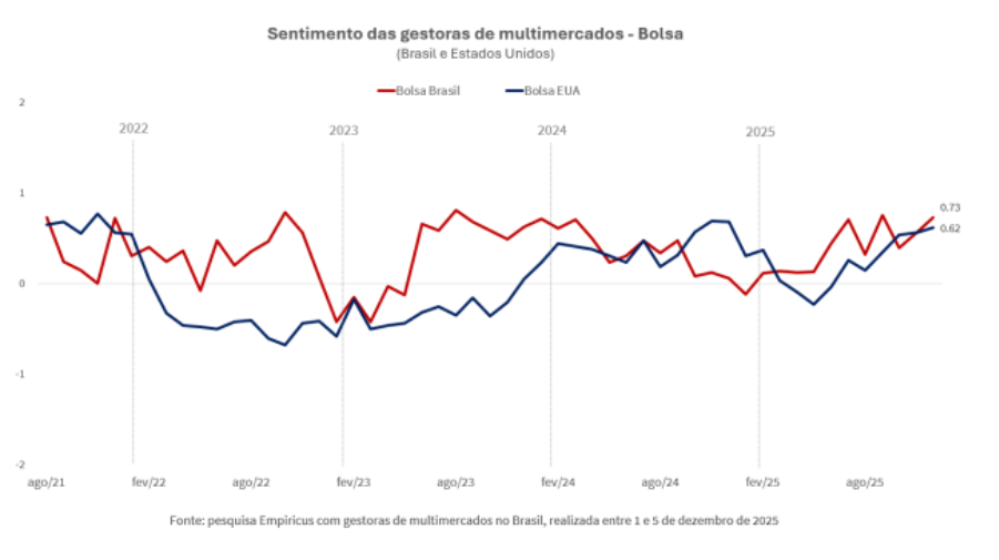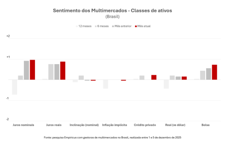 Quanto à alocação em ativos brasileiros, os gestores de multimercados reforçaram a preferência por posições aplicadas em juros nominais e reais no Brasil. O relatório também ressalta uma ampliação da exposição comprada em Bolsa, apoiados por dados de inflação mais favoráveis, expectativa de queda de juros e possível assimetria no cenário eleitoral à frente.
