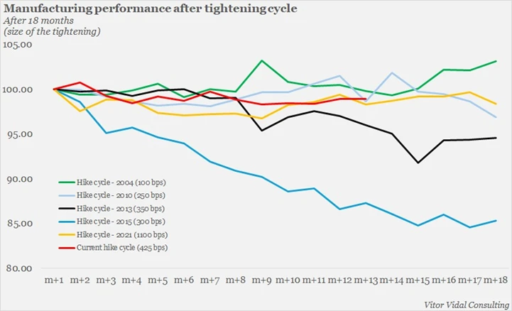O gráfico abaixo mostra o comportamento do setor manufatureiro ao longo dos 18 meses após o início de ciclos de alta de juros.