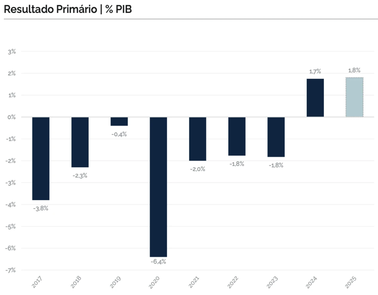 A agenda de Milei começou com um ajuste de magnitude incomum, tendo como prioridade imediata restabelecer o equilíbrio das contas públicas. Em apenas um ano, o país saiu de um déficit primário próximo de 2% do PIB para registrar um superávit de 2%, o que representa uma correção expressiva de 400 pontos-base.