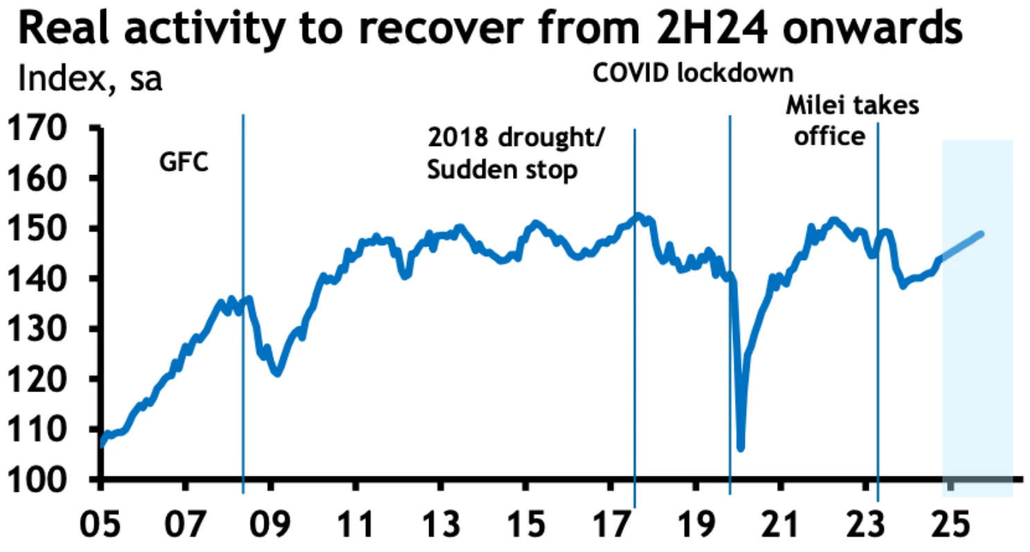 Era esperado que o choque fiscal e monetário promovido pelo governo argentino resultasse em uma contração inicial da atividade econômica — e de fato isso ocorreu. A surpresa, porém, foi a intensidade e a duração desse movimento: a queda acabou sendo menos profunda e mais curta do que se antecipava.