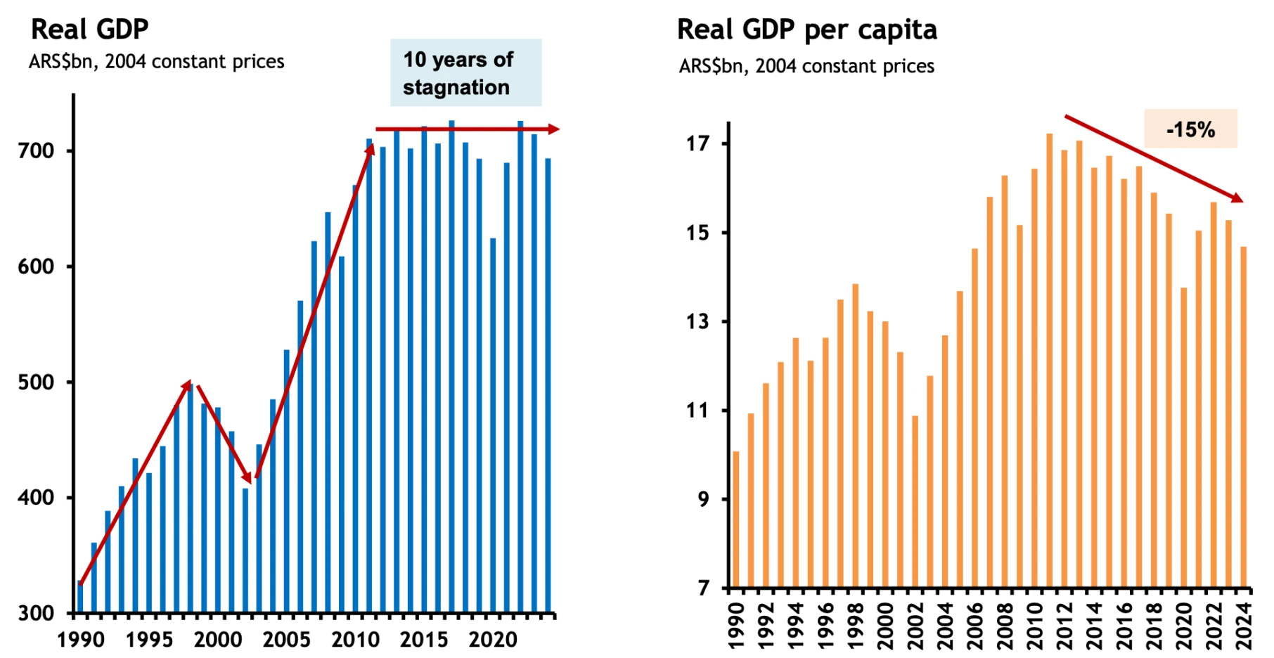 O ponto de partida, contudo, era dramático: uma verdadeira “terra arrasada”. O PIB real havia acumulado mais de dez anos de estagnação, enquanto o PIB per capita da Argentina registrava queda superior a 15% no mesmo período — reflexo direto da deterioração macroeconômica e da escalada inflacionária que se intensificou durante o governo de Alberto Fernández.