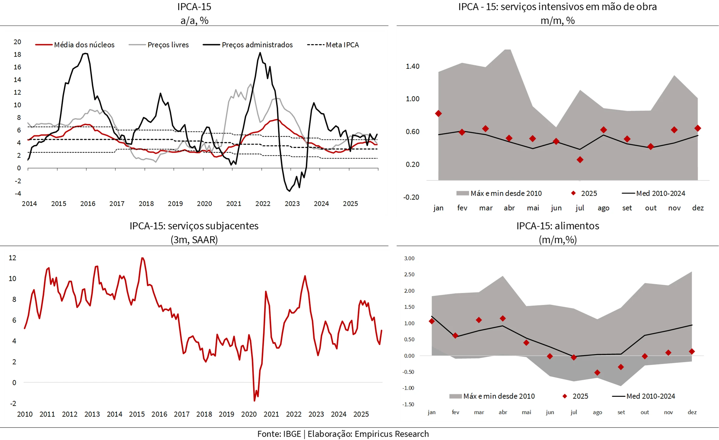 Nesta manhã, o IPCA-15 de dezembro teve alta de 0,25% m/m, em linha com a mediana do mercado.