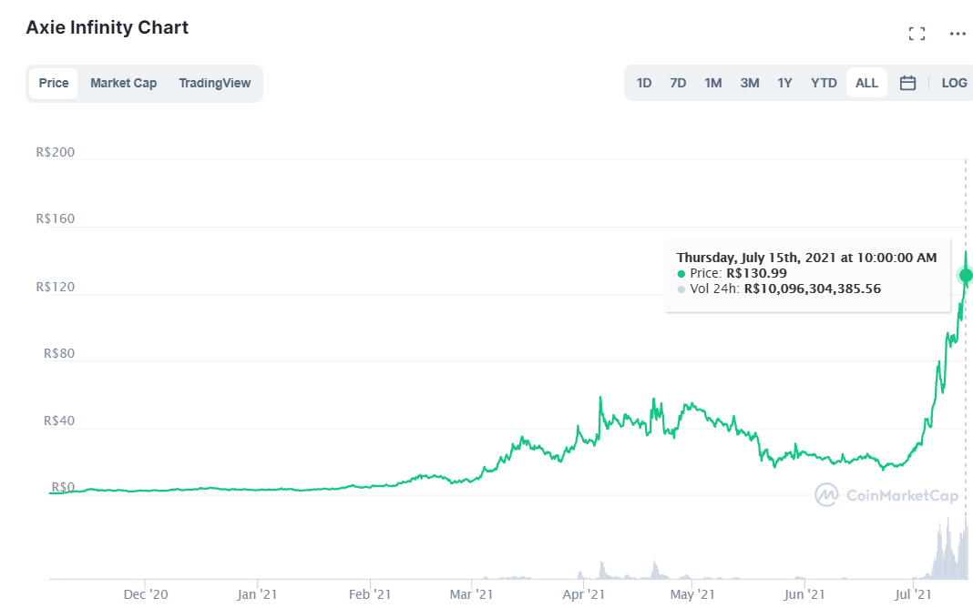 A Axie Infinity vem acumulando essa alta expressiva por um motivo bem particular. A moeda digital é vinculada a um jogo online que leva o mesmo nome da criptomoeda e que é baseado no clássico “Pokemon”. E esse game vem viralizando nas últimas semanas, atraindo cada vez mais jogadores (e dinheiro) para a sua plataforma.