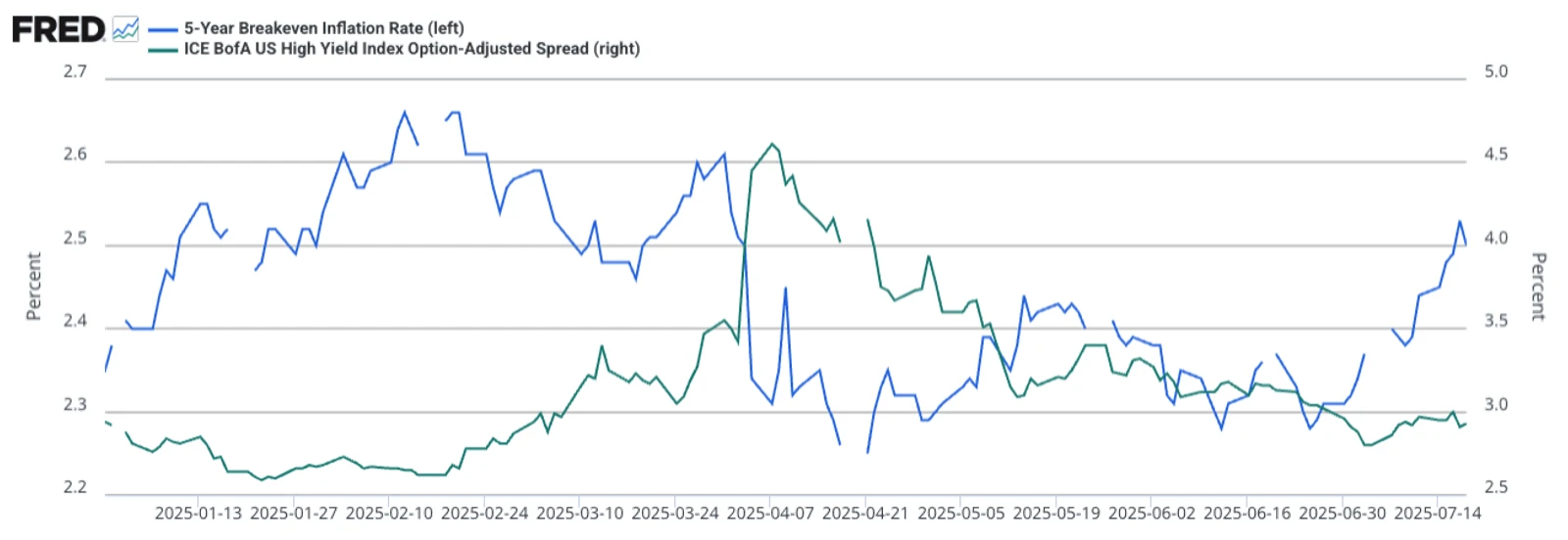 O rali do Bitcoin e das demais criptomoedas coincide exatamente com o momento em que as expectativas inflacionárias começaram a subir, após a dissipação do temor tarifário, enquanto os spreads de crédito continuaram em queda — como ilustra o gráfico a seguir.