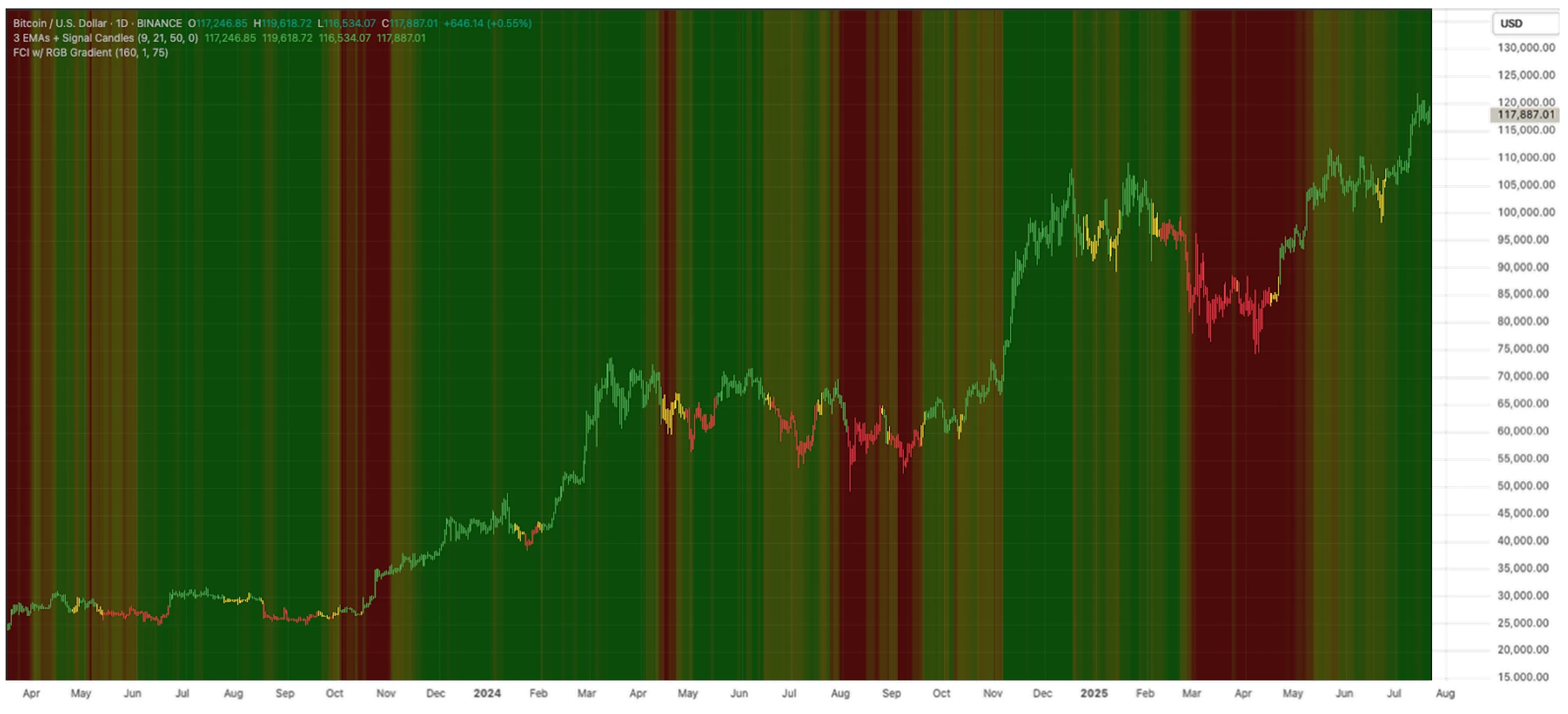 Note como os períodos marcados em verde tendem a coincidir com as principais bull runs do mercado, refletindo o efeito multiplicador que a expansão da liquidez e a compressão da volatilidade exercem sobre os ativos de maior beta — como é o caso dos criptoativos.