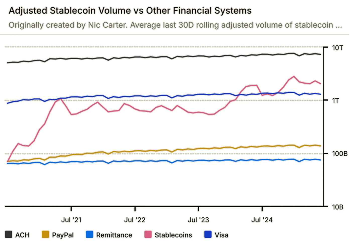 O gráfico abaixo ilustra a crescente relevância das stablecoins, mesmo enquanto operavam sob uma regulamentação ambígua — um fator que, até então, restringia sua adoção por agentes com maior capital e capacidade de distribuição.