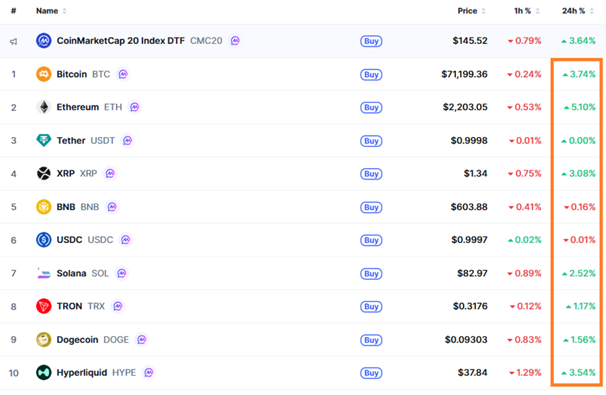 Após os Estados Unidos anunciar um cessar-fogo de duas semanas na terça-feira (7), o BTC e as principais criptomoedas reagiram com alta, como podemos ver nessa imagem da tarde de quarta-feira (8) que mostra a variação das últimas 24 horas à direita: