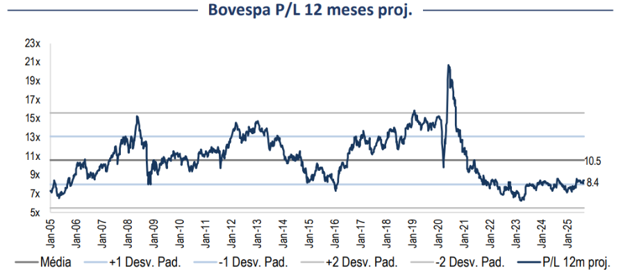Hoje, o Ibovespa negocia a 8,4 vezes lucros projetados em 12 meses, contra a média de 10,5 vezes, como mostra o gráfico abaixo: