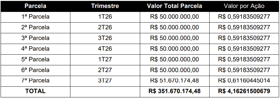 Terão direito aos proventos os acionistas posicionados no papel ao final do pregão do dia 30 de dezembro de 2025. Os dividendos serão pagos em 7 parcelas trimestrais, distribuídas entre o 1T26 e o 3T27, conforme cronograma divulgado pela companhia. As ações passaram a ser negociadas ex-dividendos a partir de 2 de janeiro de 2026.