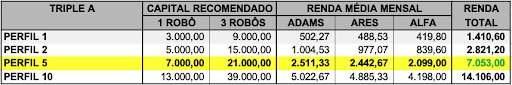 Além disso, é possível começar com um aporte mínimo de R$ 3 mil, operando com um só robô até acumular R$ 21 mil para, depois, investir operando no perfil 5.