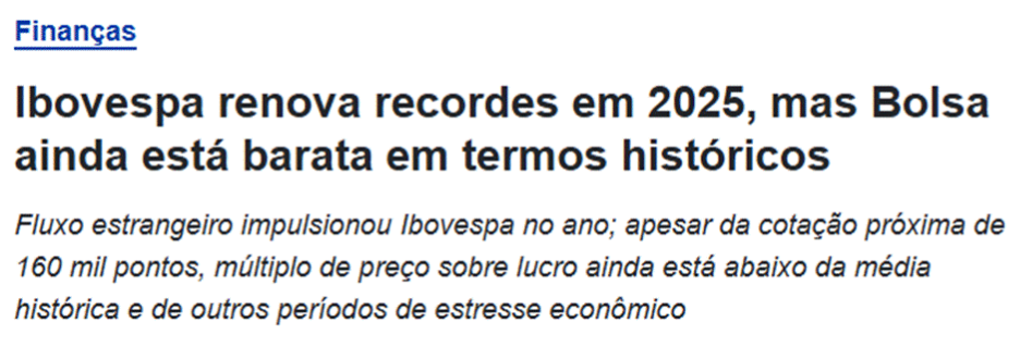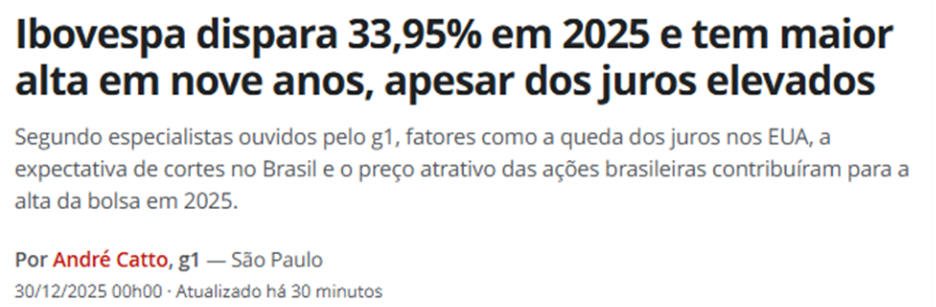 O resultado dessa combinação de fatores foi o melhor desempenho do Ibovespa nos últimos nove anos. O índice encerrou 2025 acima dos 161 mil pontos, com uma valorização de 34%.