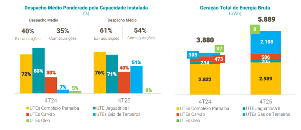A geração bruta termelétrica da Eneva saltou +52%, para 5.889 GWh, enquanto o despacho médio pela capacidade instalada subiu de 35% para 54%, ajudado principalmente pelas usinas abastecidas com gás de terceiros.