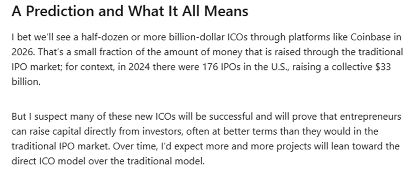 Naquela semana, Matt Hougan, CIO da Bitwise Asset Management, publicou no LinkedIn um texto em que afirma estarmos diante de mais uma revolução cripto, e que os ICOs fazem parte disso. “Aposto que veremos meia dúzia ou mais de ICOs bilionários em plataformas como a Coinbase em 2026”, afirmou.