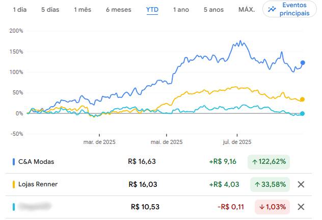 Porém, o ativo recomendado por Larissa se destaca justamente por ir na contramão neste momento. Perceba que, enquanto LREN3 e CEAB3 já acumularam altas expressivas este ano, a ação indicada ficou para trás.