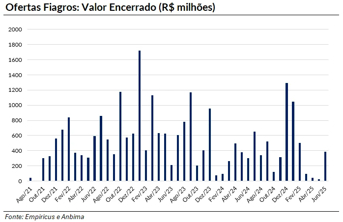Apesar da valorização, o apetite dos investidores segue contido. Em 2024, o volume de ofertas de FIagros recuou 45% em relação ao ano anterior. Já em 2025, o montante total somou R$ 2,1 bilhões até junho, alta de 30% na comparação anual. A baixa liquidez permanece como fator central para o desempenho de curto prazo da categoria, dinâmica também observada em outras fontes de financiamento e que pode influenciar a perspectiva de crédito do setor nos próximos trimestres.