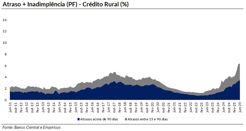 Ainda que alguns segmentos, como café e cacau, tenham alcançado valores recordes em 2025 — impulsionados por choques de oferta —, o risco de crédito atingiu o maior nível das últimas décadas, refletido no aumento da inadimplência.