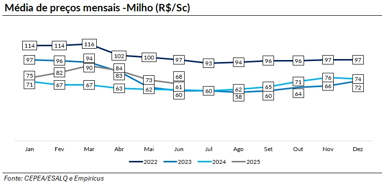 Do lado da demanda, a Conab projeta um aumento no consumo interno para 90 milhões de toneladas, impulsionado principalmente pela recuperação gradual da produção de proteína animal, sobretudo de carne suína e de frango, que têm o milho como base da ração. Por outro lado, o volume exportado deve recuar em relação à safra anterior, em razão do aumento consistente da demanda interna por milho e da projeção de maior disponibilidade de milho no mercado internacional, especialmente de produto norte-americano, em meio à expansão de área da cultura nos Estados Unidos.