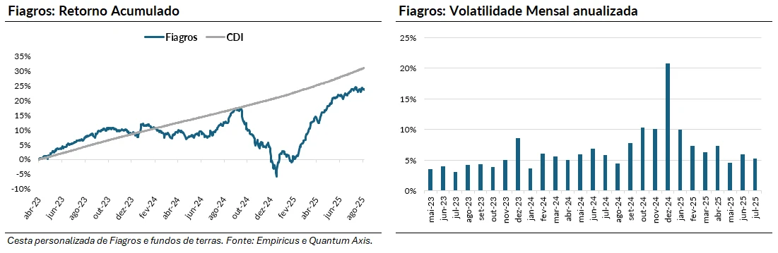 Nos Fiagros e fundos de terras, as cotas dos fundos naturalmente registraram aumento de volatilidade, especialmente após o segundo semestre do ano passado. O movimento esteve diretamente ligado ao crescimento dos problemas de crédito nas carteiras, com anúncios de renegociações, fraudes, inadimplência e recuperações judiciais. Somado a uma conjuntura macroeconômica desafiadora, o cenário levou as cotações às mínimas no fim de 2024.