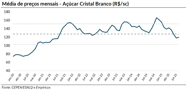 Do ponto de vista dos produtores e usinas, o risco de crédito de curto prazo encontra-se relativamente mitigado, dado que boa parte da comercialização da safra 2025/26 foi antecipada, com contratos já firmados a preços fixados — o que protege as margens em um cenário de retração no mercado spot.