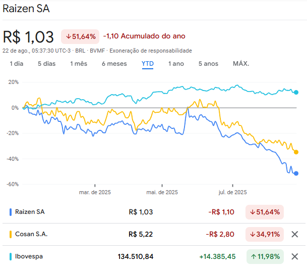 Para ter ideia, em um mês, o papel da produtora de etanol despencou 30% e já se aproxima de virar uma “penny stock”, custando R$ 1,03. No ano, a queda já acumula mais de 50%: