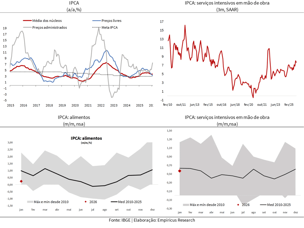 No Brasil, o IPCA de janeiro foi divulgado nesta manhã. O indicador de preços subiu 0,33% m/m, marginalmente em linha da mediana das expectativas de 0,32%.