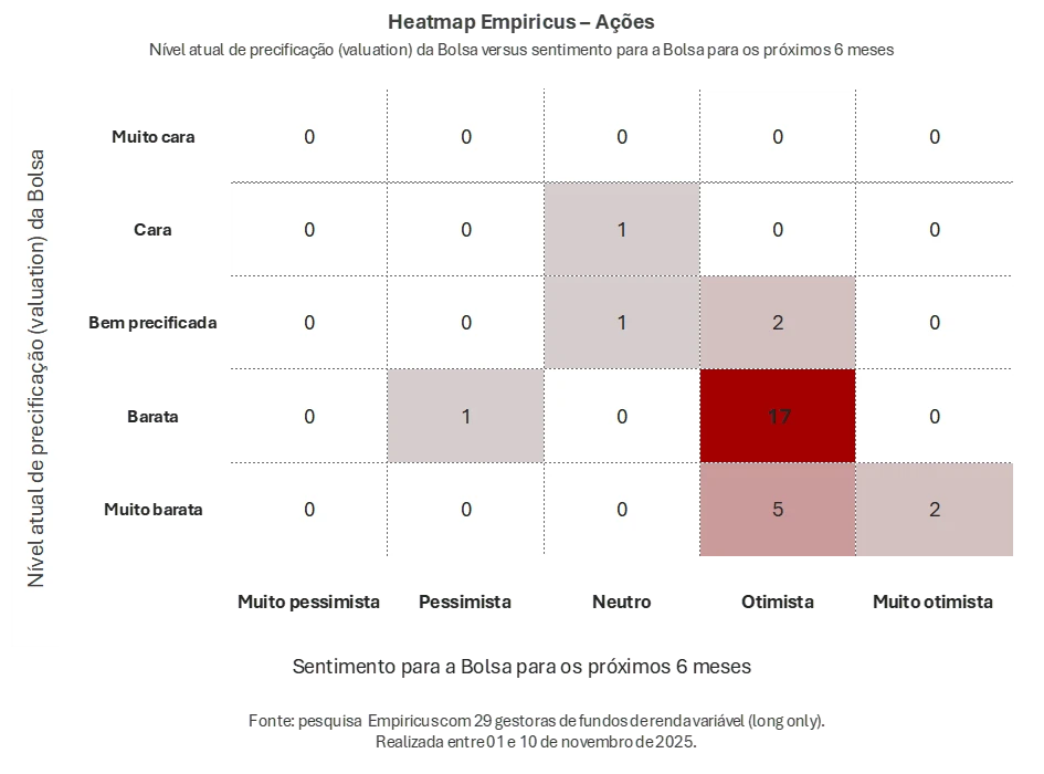 A percepção predominante sobre a bolsa brasileira segue muito positiva, segundo pesquisa mensal feita pela série Os Melhores Fundos de Investimento, da Empiricus Research, com 29 gestoras de fundo de renda variável que somam cerca de R$ 78 bilhões de patrimônio líquido nas estratégias da classe (long only e long bias).