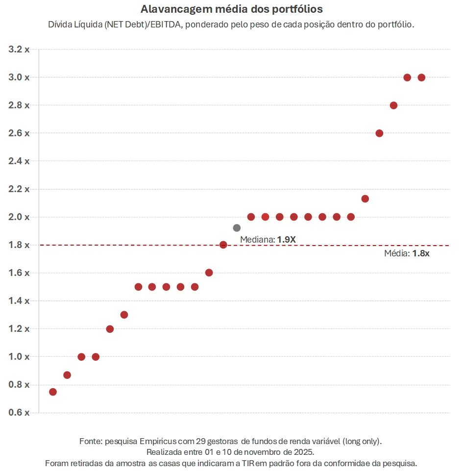 A alavancagem média dos portfólios apresentou um leve aumento em relação ao mês anterior, passando de 1,6x para 1,8x. A mediana também subiu, de 1,5x para 1,9x.