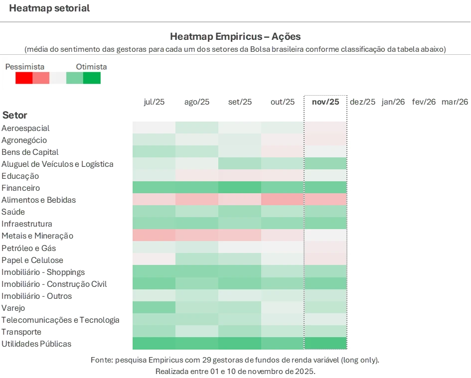 A pesquisa também mediu o sentimento dos gestores em relação a cada setor atualmente, ponderando suas percepções de comportamento e expectativas. No heatmap (mapa de calor) abaixo é possível observar as respostas, sendo a cor verde um maior otimismo para o setor e a cor vermelha, um pessimismo.