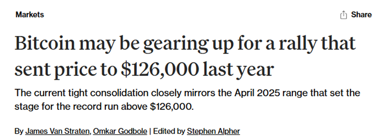 Uma matéria publicada no portal CoinDesk defende que o bitcoin pode estar “se preparando para um rali semelhante ao que levou os preços a US$ 126 mil no ano passado” (em tradução livre):