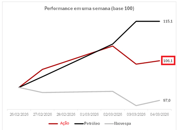 O relatório expõe que, desde o agravamento das tensões no Oriente Médio, o comportamento dessa ação, em especial, descolou do desempenho do Ibovespa e passou acompanhar a valorização do petróleo brent, chegando a performar 9,1 pontos percentuais acima do índice da bolsa brasileira.