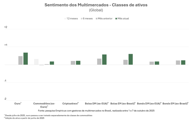 O ouro também ganhou espaço nas carteiras “consolidando-se como uma das classes de melhor desempenho no ano e atuando como proteção adicional em um ambiente de incerteza prolongada sobre juros e crescimento”, afirmou o analista.