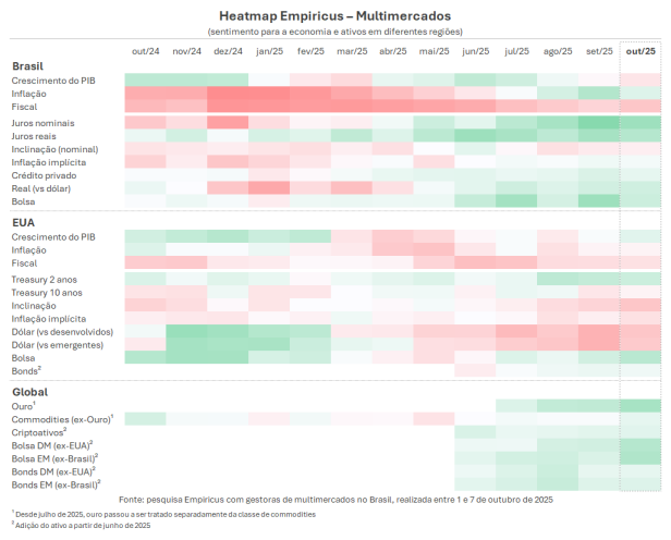 No heatmap abaixo é possível observar a evolução mês a mês do sentimento dos gestores sobre a economia e os ativos em diferentes regiões. Quanto mais vermelha a cédula, maior o pessimismo dos gestores. Quanto mais verde, maior o otimismo.