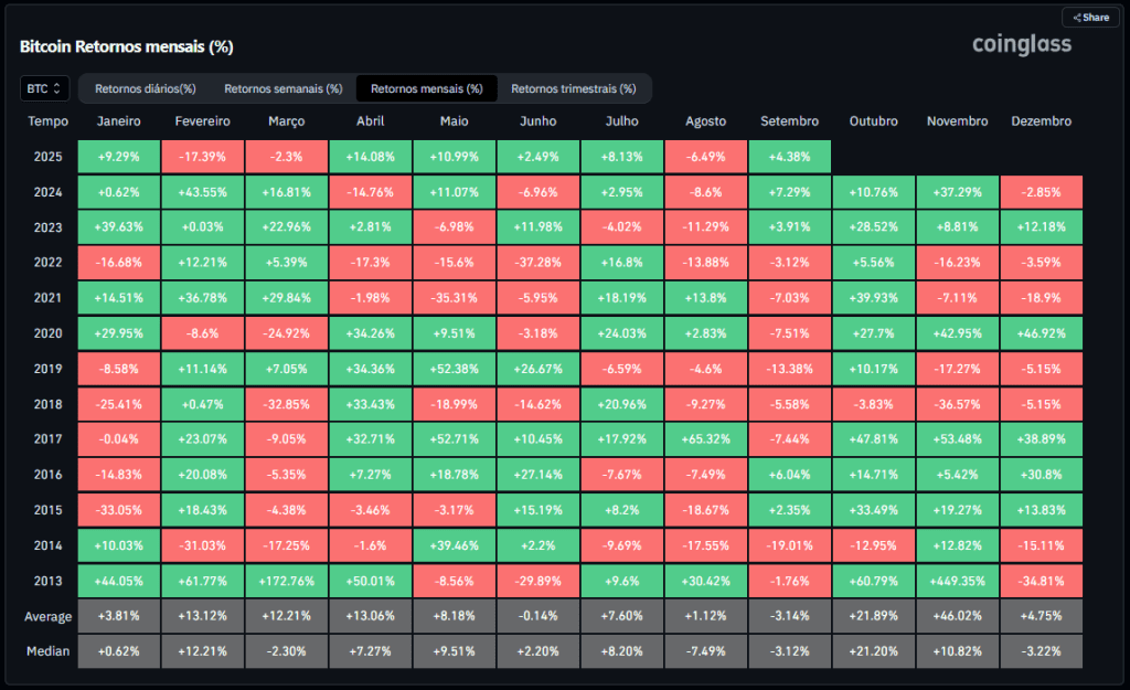 Ao contrário de agosto e setembro, outubro historicamente apresenta forte sazonalidade positiva para o Bitcoin, com retorno médio de 21,89%. Esse movimento costuma ser apenas o início de uma tendência de alta no fim do ano: em novembro, a média histórica de retornos sobe para 46,02%.
