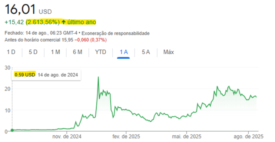 Um ano atrás, esse papel custava apenas US$ 0,59. Agora, o valor de tela é de US$ 16, uma valorização de mais de 2.600%. O “gatilho” ativado neste período foi a definição de um contrato dessa empresa com a NASA em dezembro de 2024, que colocou a ação em evidência para parte do mercado.