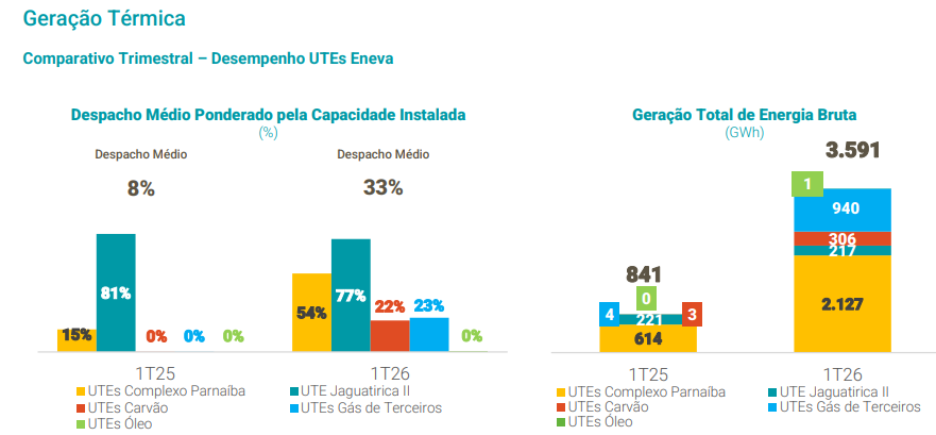Nesse contexto, o despacho médio das usinas da Eneva atingiu 33% no 1T26, ante 8% no ano anterior. A geração bruta chegou a 3,6 GWh, aumento anual de 327%, com grande destaque para as usinas que usam gás próprio como combustível (Complexo Parnaíba e Jaguatirica II).