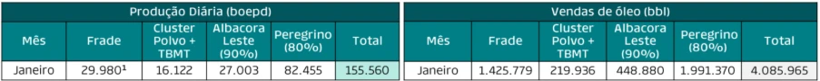 Na comparação sequencial, houve evolução nos campos de Peregrino, Albacora Leste e no cluster Polvo + Tubarão Martelo, refletindo a continuidade dos avanços operacionais observados ao final de 2025. Em Frade, por outro lado, a produção média foi de 30 mil barris por dia, levemente abaixo dos 31,6 mil registrados em dezembro, impactada por uma falha pontual no sistema de geração de energia que afetou um dia de produção.