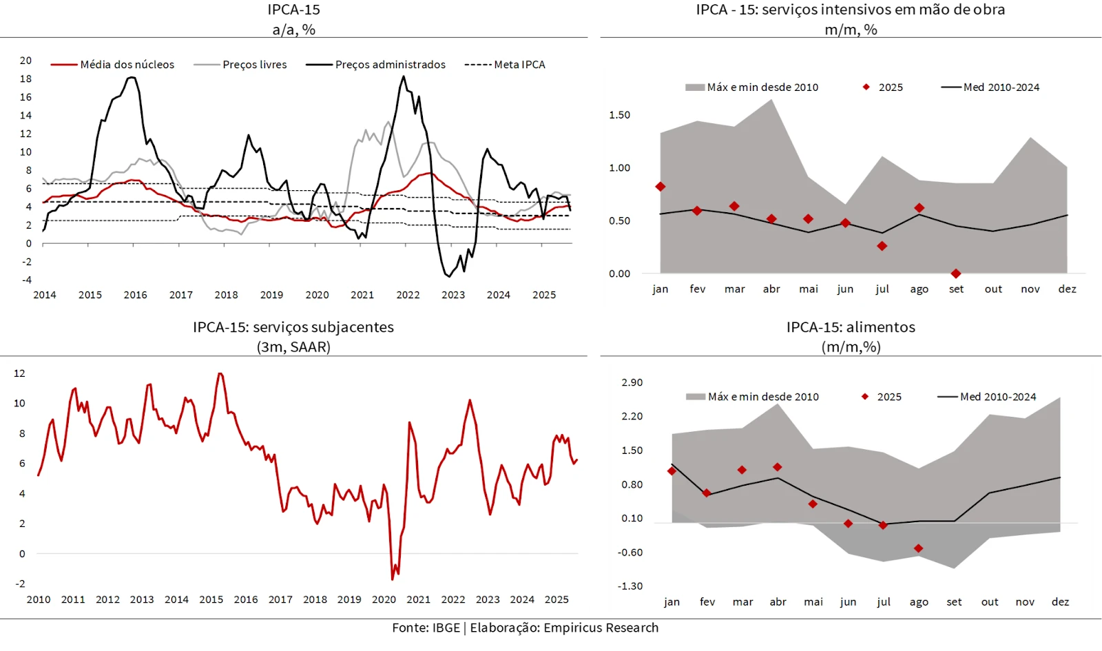 De maneira geral, o qualitativo do resultado do IPCA-15 foi pior do que o esperado devido a reaceleração das medidas de núcleo. Contudo, mantida a tendência de queda do indicador, continuamos esperando o início do ciclo de corte de juros ainda neste ano.