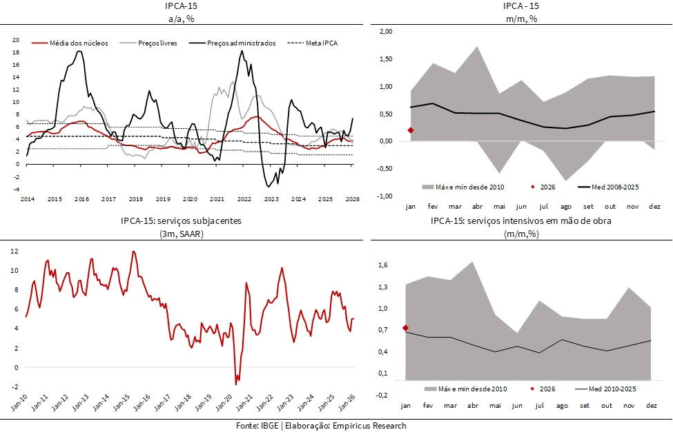 No Brasil, o IPCA-15 divulgado na terça-feira (27) subiu 0,20% m/m em janeiro, abaixo da mediana das expectativas do mercado de 0,22% e consideravelmente abaixo da sazonalidade do período.