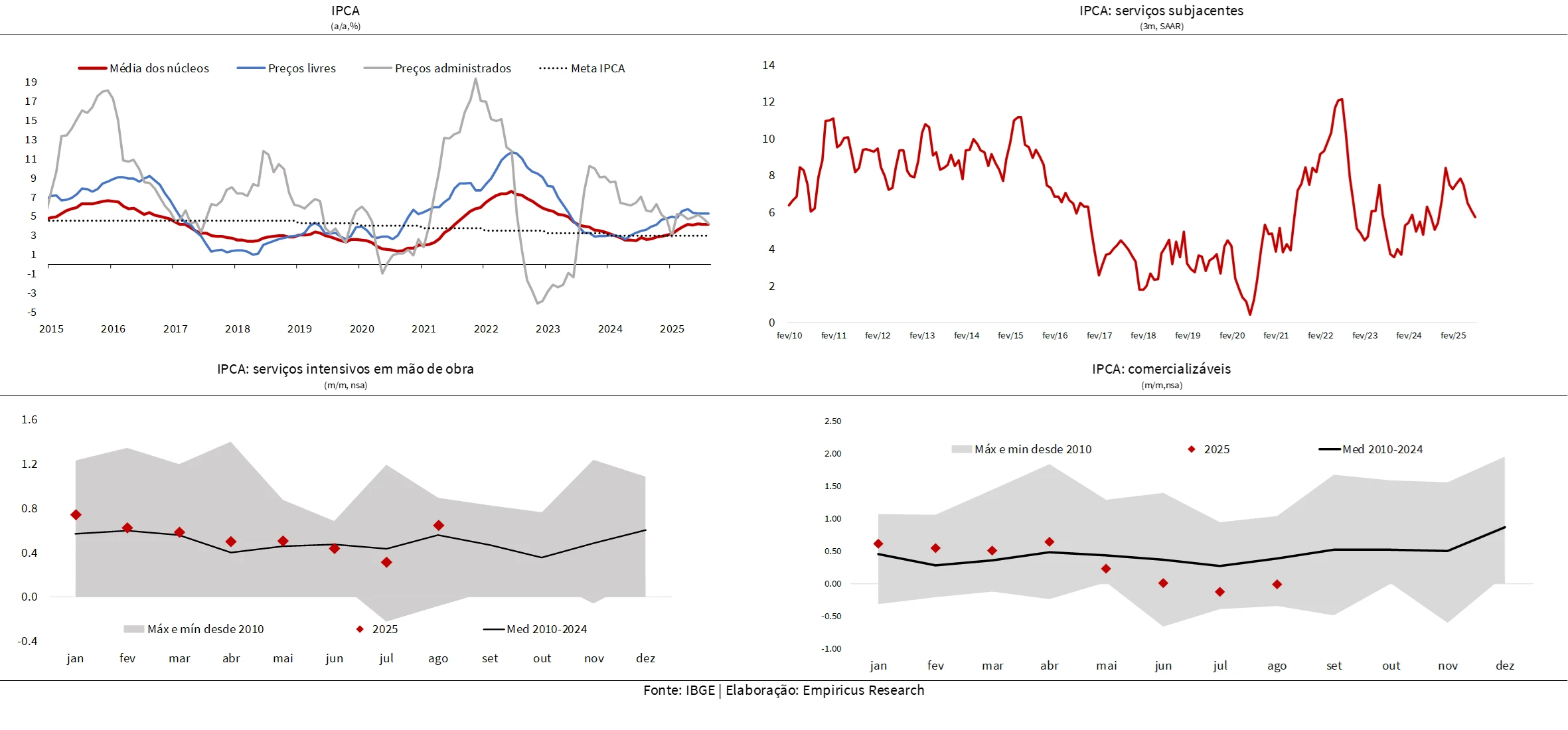 No Brasil, o IPCA de agosto mostrou deflação de 0,11% m/m, acima das expectativas de queda de 0,15%. Além do número cheio ter surpreendido para cima, o qualitativo do dado também decepcionou.