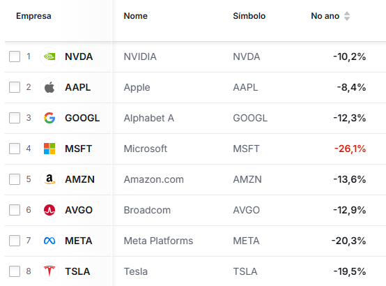 A variação negativa também é observada em outros nomes dentre as sete magníficas (Nvidia, Apple, Tesla e Amazon). O movimento coincide justamente com a duração da guerra entre Estados Unidos e Irã, que fez o mercado olhar para esse setor com mais cautela.