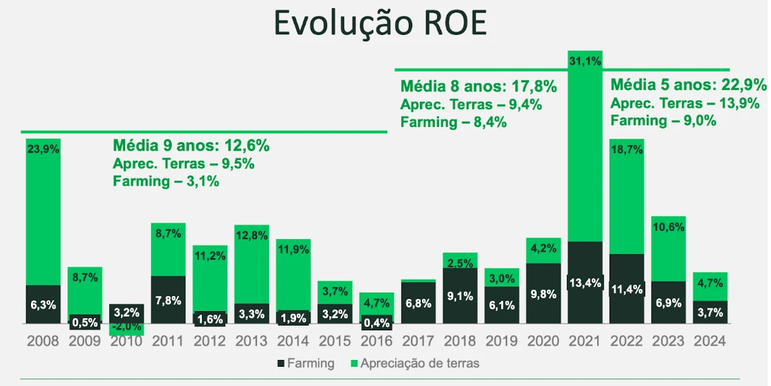 Com exceção de 2024, muito afetado por quebra de safra e preços nas mínimas, o ROE tem se mantido em níveis interessantes e, mais importante, tem mostrado ganho de importância da operação agrícola (farming) nos últimos anos, o que deixa os resultados menos dependentes da apreciação de terras e refletem melhor a qualidade operacional da companhia.