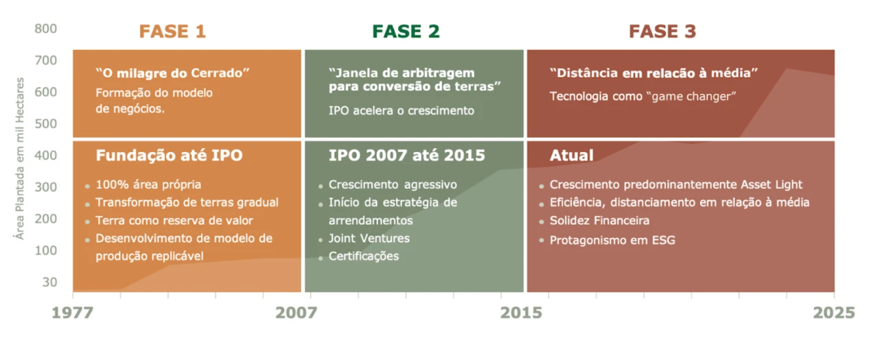 É claro que a apreciação de terras é importante para o negócio, e o CAGR “mesmas fazendas” quase seis pontos percentuais acima do CDI nos últimos 18 anos mostra que a SLC também tem essa expertise. Mas esse não é o seu core business, e tende a ser menos relevante no atual estágio (fase de crescimento 3), focado em aumento de eficiência operacional, asset light e tecnologia.