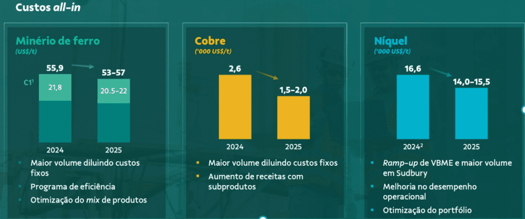 Ajudados por essas e outras iniciativas, os custos all-in de Minério de Ferro entregues na China devem ficar perto do low do guidance (US$ 53/ton – US$ 57/ton). As reduções para Cobre (-32%) e Níquel (-11%) considerando o meio do guidance são ainda mais expressivas, reflexo principalmente do aumento de produção.